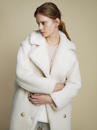毎年人気のウール混ボアにPコートタイプが登場。キャッチーな素材感でモダンにアレンジし、ゴールド釦が大人っぽいアクセントを添え、リラクシーかつ上品な雰囲気に仕上げています。