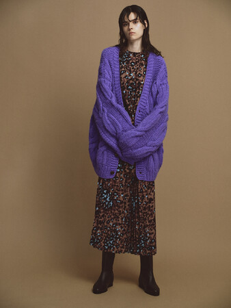 ブラウンとサックスのカラーミックスが美しいオリジナルのレオパード柄を使用したフェミニンワンピースに、一枚一枚ハンドメイドで仕上げたリッチなカーディガンをオン。歩くたびに揺れる軽やかなシルエットのワンピースと、イタリア糸ならではの発色を活かしたカラーカーディガンで秋冬を彩ります。