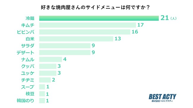 好きな焼肉屋さんのサイドメニューについて100人にアンケートを行ったところ、「冷麺」と回答する人が最も多い結果となりました。