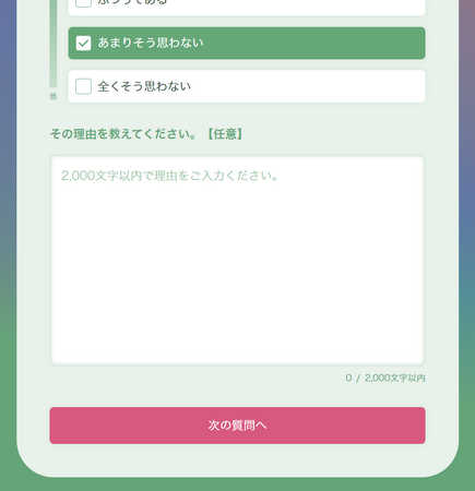 ※5段階評価、6段階評価(5段階+サービスを受けていない場合の選択項目)のチェックボックスを入れると、フリーテキストのフォームが表示され、2,000字以内で評価の理由が入力できます。