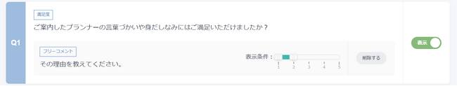 「理由ヒアリング機能」は、満足度評価点に応じて、その理由を問うフォーム(フリーテキスト)を表示する機能。5段階評価で1~2の低評価をつけた方を対象として、理由を問うフリーテキストのフォームを表示し、カップルの不安や不満の理由を収集できます。