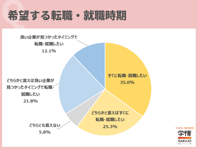 株式会社学情(本社:東京都千代田区)は、20代の仕事観や働く意識をひも解くために、アンケート調査を実施しました。今回は、「転職希望時期」に関して調査。6割以上の20代が「すぐに転職したい」と回答しました。転職先の企業への入社希望時期は、「2023年9月・10月」が半数を占めます。「下期が始まるタイミングだと、中途入社の人も多いと思う」「3月決算の企業は10月から下期なので、区切りの良いタイミングで入社できると思う」「新入社員が入社するまでの半年間で、仕事を覚えていきたい」といった声が上がりました。次いで回答を集めた入社希望時期は、「2024年4月」でした。「4月入社だと同時期入社の人も多いと思う」「新入社員研修に一緒に参加できると嬉しい」といった声が寄せられています。