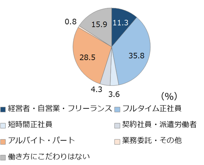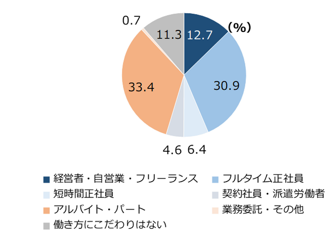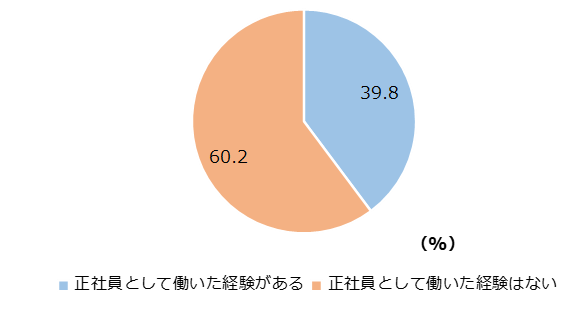 フリーターとして働く人のうち、正社員経験のある人は39.8%。そのうち、正社員として働いたことがある人に、今後最も希望する働き方を聞くと、「アルバイト・パート希望(33.4%)」が最も多く、次いで「フルタイムの正社員希望(30.9%)」となった。【図1、2】