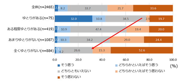 現在希望のキャリアを歩めているかを聞いたところ、「そう思う(歩めている)」が11.0%、「そう思わない(歩めていない)」が55.3%となった。経済的にゆとりがないと答えた人ほど、希望のキャリアを歩めていないと感じる人の割合が多かった。