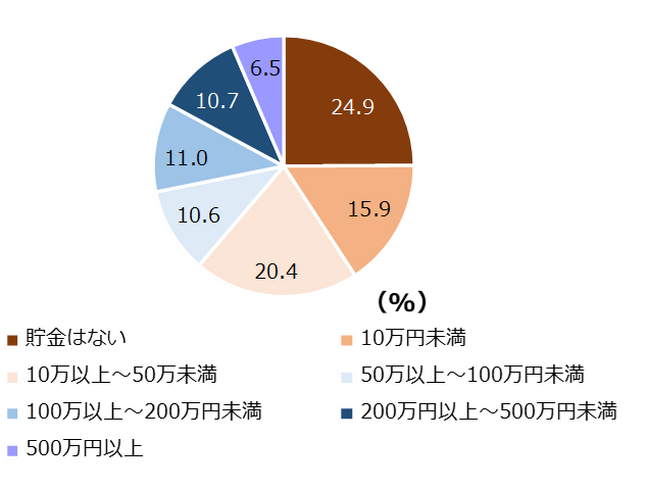 また、経済的なゆとりについては、80.0%の人が「ゆとりがない」と回答。ゆとりがないと答えた人に現在の貯金額を聞くと、「貯金が無い(24.9%)」が最も高く、次いで「10万円以上~50万円未満(20.4%)」となった。【図3、4】