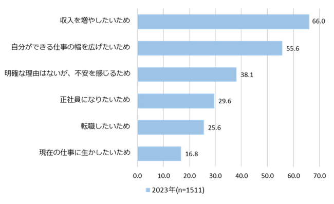 学び直しの必要性について聞くと、61.3%が「必要性を感じている」と回答した。理由を聞くと、「収入を増やしたいため(66.0%)」が最も多かった。【図7、8】
