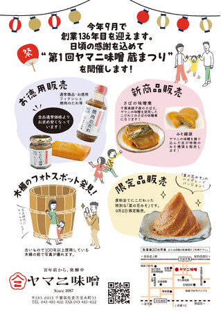 株式会社ヤマニ味噌(千葉県佐倉市)は、創業136年で初となる蔵びらきイベント「ヤマニ味噌 蔵まつり」を9月2日(土)に当社本社にて開催いたします。味噌蔵の見学や味噌の詰め放題、数量限定で甘酒や味噌きゅうりを来場者にふるまうほか、お菓子つかみ取りなどお子様やご家族連れでお楽しみいただける催しを多数用意しています。