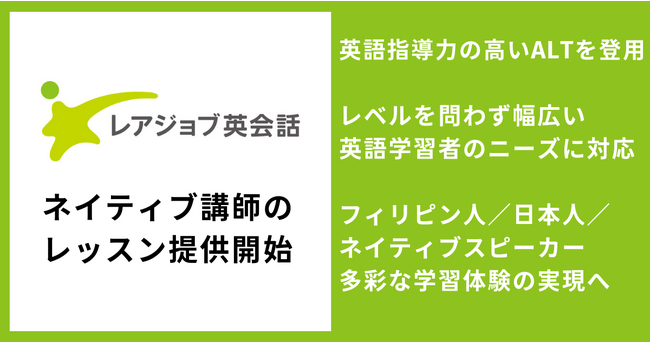 スキルの可視化と向上を支援する“AIアセスメントカンパニー”の株式会社レアジョブ(以下、レアジョブ)は、全国の教育機関で勤務するALT(※1)によるレッスン提供を皮切りに、ネイティブ講師(※2)によるレッスン提供を拡充していくことをお知らせいたします。