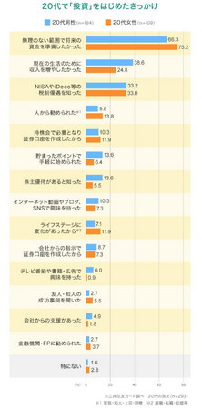 投資を始めたきっかけを見ていくと、全体では「無理のない範囲で将来の資金を準備したかった」(69.6%)がトップ。男女ともに1位ですが、女性の方が男性よりも割合が高くなっています。
