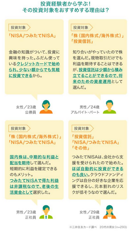 投資歴が長くない20代でも、目的に合わせて複数の商品に投資している人も多く、「少額から投資が可能」「配当や譲渡益が非課税」「支払い方法が簡単」など、それぞれの特徴を把握して投資をしているようです。