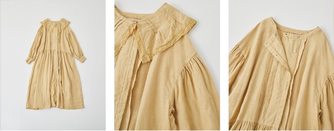 着脱可能な付け襟がセットになったワンピース。襟は前下がりを敢えて深めにすることで、ノスタルジックな雰囲気に仕上げました。さらにピンタックで立体感を出しつつ、衿端はコットンレースを贅沢に使用しています。