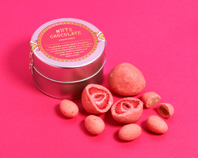 いちごのホワイトチョコでドライいちごとアーモンドをコーティング「いちごナッツ缶」