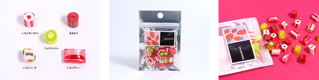 福岡県産あまおうの「あかい・まるい・おおきい・うまい」をイメージしたいちごのキャンディをミックスしました。あまおう・いちごヨーグルト・ミックスベリー・いちごソーダ・いちごティーという5種類のキャンディで、ピンクと赤が引き立つように、いちごの花絵柄をアクセントに入れました。ミックスベリーは、イチゴ・ラズベリー・クランベリーの3種類のフレーバーをミックスして仕上げています。