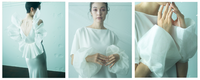 カロンホワイトのドレスは「人生」をテーマに、主人公がその幕を下ろす時まで、ドレスとともに自分のKALONを表現し、ドレスを通して、日常の中で生まれる記憶を「私物語」として綴ることを提案します。