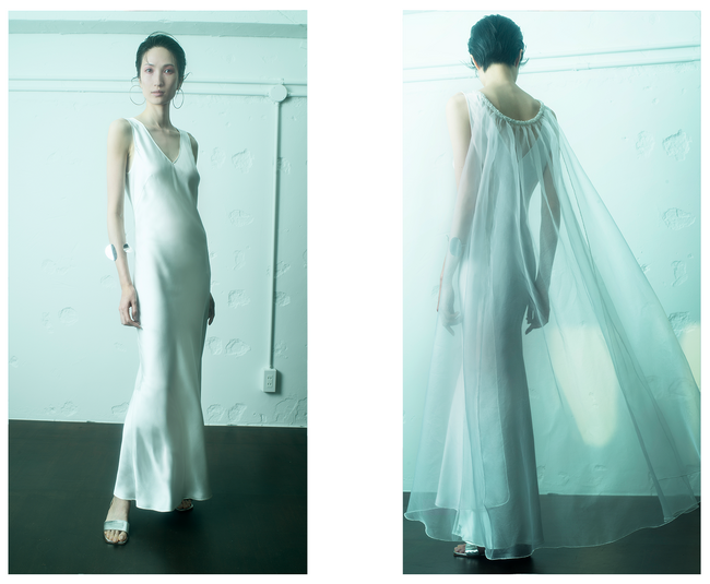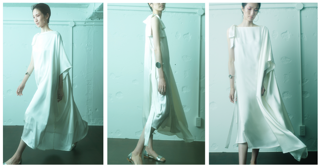 ブランドネームにちなんだシグニチャードレス。洋服の始まりとされる一枚布から作られた古代ギリシャの服飾と日本の伝統である和着物を同時に彷彿とさせながら、左右で全く異なるスタイルを表現したユニークなデザイン。シルクサテンの特性を活かした、表情豊かで流れるようなフォルムが特徴です。