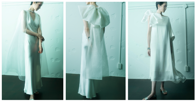 デビューアイテムとしてドレス3型&アレンジの組み合わせからスタート。年内に2型追加予定で新作などは不定期に発表。美容含むトータルビューティープランやオリジナルウェディング企画にも対応する予定。展示会開催日を随時SNS、HPにて公開予定。