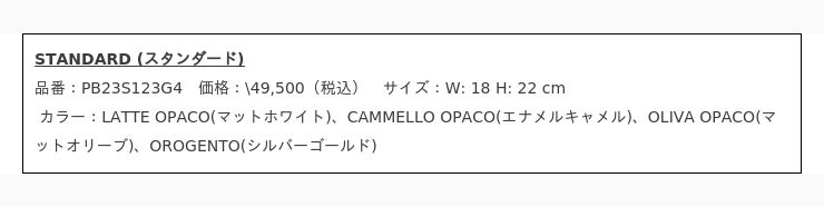 ショートストーリーに出てくるキーカラーとリンクさせ、マットホワイト、エナメルキャメル、マットオリーブが新色として登場。中園ミホ氏が選んだシルバーゴールドも加えた4色のSTANDARD(スタンダード)に、期間限定でショートストーリーブックが付属されます。