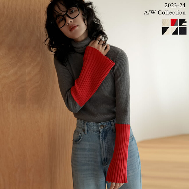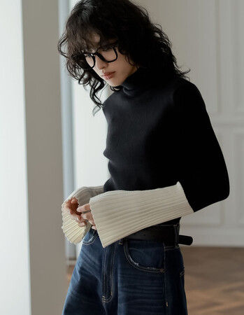 フレアスリーブデザインが旬な雰囲気を演出するハイネックニットトップス。