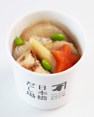 「冷やしおでん」は、こだわりのかつお枯節を贅沢に使った、おだしがジュレの冷たいおでんです。おでんの定番具材である大根やちくわ、夏を感じるヤングコーンなど、6種の具材をかつお節だしを利かせてしっかり煮込み、枝豆をトッピングし彩り豊かに仕上げました。だしジュレを絡めながら召し上がって頂くとより美味しく頂けます。