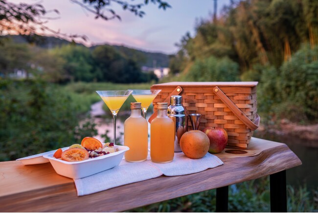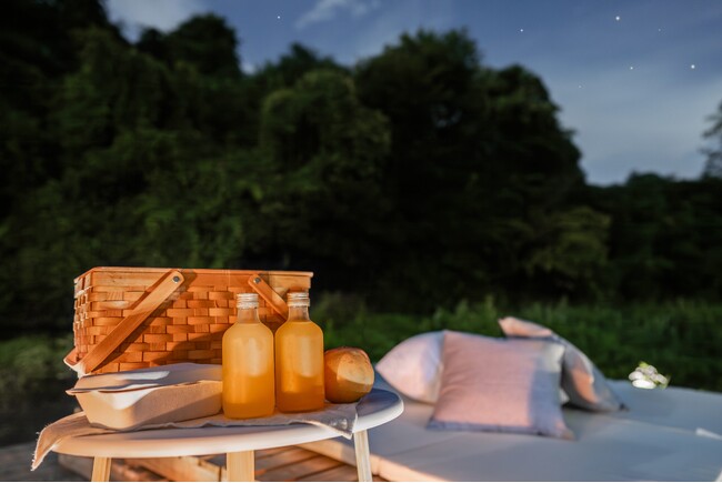 涼しくなった秋の夜に、川沿いでお酒をたしなむエリアを複数ご用意。カクテルの材料やおつまみをラウンジで選び、ナイトピクニックセットを作るサービスも。
