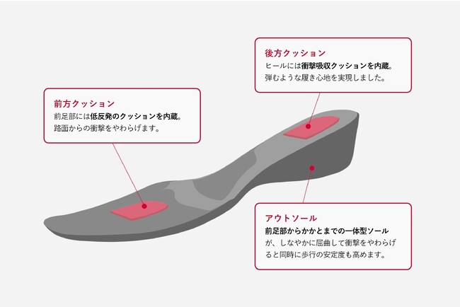 2. ヒールデザインは、お客様からご要望の高いワンヒールタイプを前足部からかかとまでが一体型の「3in1ソール」で表現。ソール全体はクッション性、グリップ性、屈曲性の高いラバー素材を採用することで、パンプスでありながらスニーカーのような履き心地を実現しています。インソールは抗菌防臭機能素材を使用。ノンスリップ素材で足が前に滑るのを防ぎます。