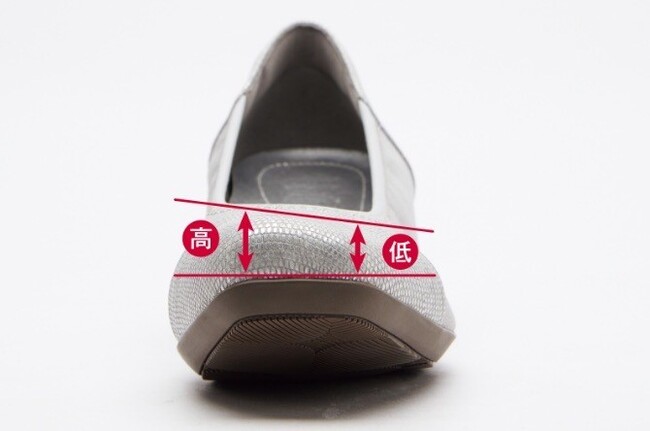 1. 当社オリジナルの、センターラインを親指寄りに振った「足なり設計」を採用。一般的な靴に比べてセンターラインが親指側に寄っており、前足部を幅広にすることなく、親指がまっすぐに伸びるフォルムを実現しました。外反母趾の足でもポインテッドトウにチャレンジしやすい仕様です。