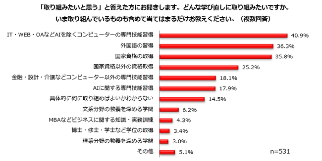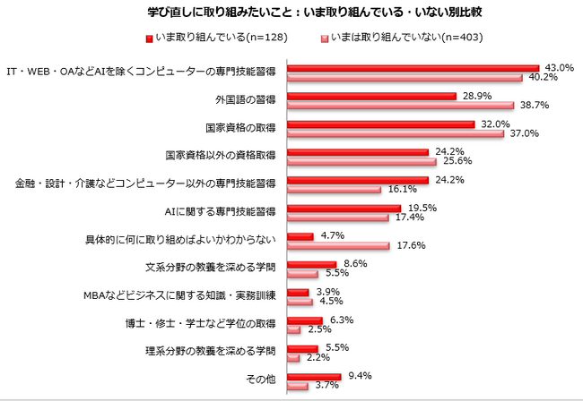 学び直しに取り組みたいと思うと答えた人にどんな学び直しに取り組みたいかを尋ねたところ、「IT・WEB・OAなどAIを除くコンピューターの専門技能習得」が最も多く40.9%。次いで「外国語の習得」36.3%、「国家資格の取得」35.8%と続きました。さらに、学び直しに取り組みたいことをいま取り組んでいる・いない別で比較したところ、「具体的に何に取り組めばよいかわからない」と答えたのは、取り組んでいる人は4.7%だったのに対し、取り組んでいない人は17.6%と差が最も顕著に表れました。学びたいことが具体的になると行動に移しやすくなるのではないかと思われます。また、回答者全員に「学び直しに取り組むことによって、どんなメリットがあると思いますか」と尋ねると「転職・再就職がしやすくなる」との回答が最も多くなりました。さらに回答を実際の取り組み状況別に比較すると「ビジネスパーソンとして成長できる」などポジティブな項目の比率は総じて実際に取り組んでいる人が最も高かったものの、「賃金が上がる」と「昇進・昇格がしやすくなる」は顕著な差が見られませんでした。学び直しすることで賃金や昇進といった直接的な実利よりは、転職の可能性や人材としての市場価値向上、モチベーションアップといった自己投資としての意義を感じている人が多いようです。フリーコメントには、学び直ししたいものの、時間とお金が不足しているという声が多数寄せられました。政府はリスキリング時の補助金を設置して支援に取り組んでいますが、実際に学び直しに取り組む人が増えるか否かは、さらに時間の融通も含めた心身のゆとりをケアできるかが鍵を握っているのではないかと考えます。