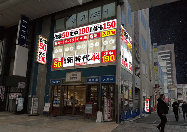 店舗は、熊本県熊本市中央区に位置するアーケード商店街内、通町筋駅から徒歩1分の好立地。ビル2階の空中階の店舗。徒歩5分圏内に、『新時代』の熊本1号店が位置し、両店舗とも毎日11:30~翌1:00まで営業し、『昼飲み』もご好評となります。