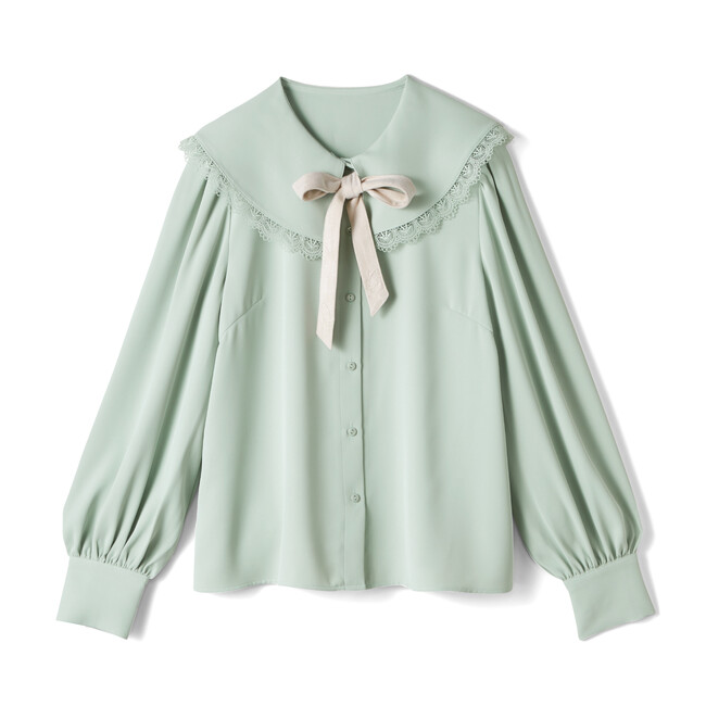 淡いグリーンのブラウスは、妖精の森の葉っぱを映した色。葉脈みたいなレースがあしらわれています。大きめの衿やふんわりとした袖、妖精の羽の刺しゅうをほどこしたリボンなど、クラシカルな雰囲気が魅力です。