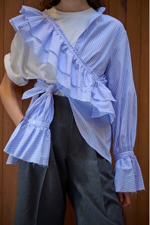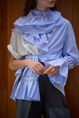 定番人気の「オーバーサイズ レギュラーカラーシャツ」では、お客様から要望の多かったSサイズを今季から新たにラインナップ。より一層ユニセックスでお楽しみいただけるコレクションとなりました。また新作コレクションでは、取り外し可能なフリルを結んでスカーフのようにあしらったり、たすき掛けや襟元でラッフル風にしたりと一枚で何通りにも着用できる「マルチウェイフリルシャツ」、フリルの取り外しでミニマムなスタイリングも楽しめる「2Wayサロペット」、袖の大きいカフスと両胸のダブルポケットがポイントの「ダブルポケットシャツ」が新たに登場いたします。