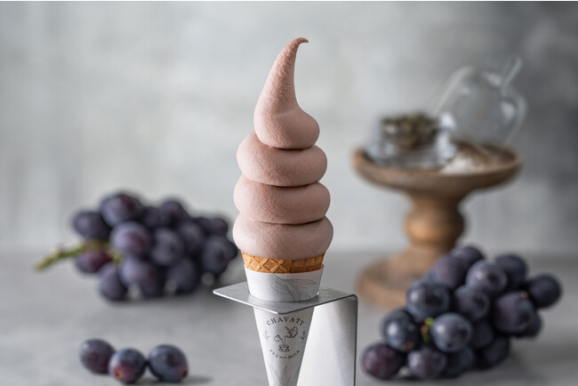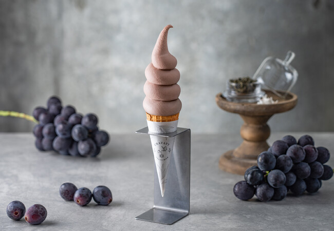 巨峰は「ぶどうの王様」といわれ、大粒ぶどうの先駆けとして長きにわたり愛されてきた高級果実です。今回は、古くから培われてきた高度な栽培技術で美味しいぶどうを作り続けている、山梨県峡東地域のこだわりの巨峰を使用しています。きれいに染まった黒く大きな粒を、皮ごと余すことなく絞り出して丁寧に裏漉して、鮮やかな色付きから香りまで、最大限に引き出すことで活かされた果実感を大切にし、厳選した茶葉と合わせてオリジナルのティーソフトクリームに仕上げました。巨峰の強い甘みと香りを存分に感じながら、余韻に残る、きりっと澄んだ銀毫ジャスミンの華やかな香りが印象的な仕上がりとなっています。