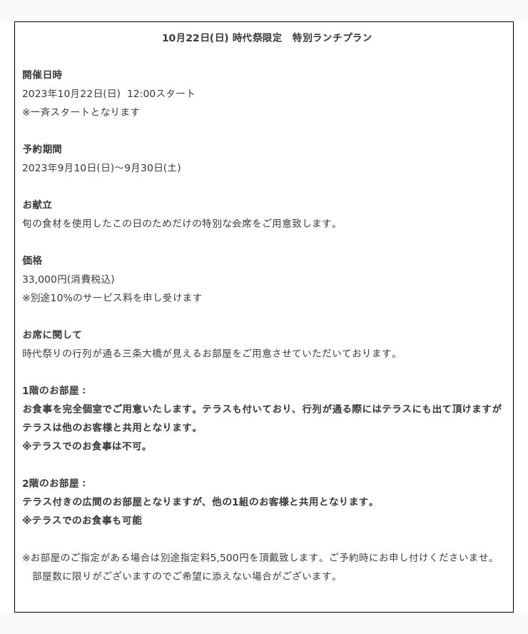 GLIONグループ(ジーライオングループ 所在地:兵庫県神戸市)は、同グループが運営する京料理 箔(京都市中京区木屋町通三条上ル上大阪町)が2023年10月22日(日)に開催される時代祭の行列をお食事をしながらご覧頂くことができるランチプランの予約を開始致しました。