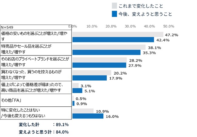 「商品選び」は唯一、変えようと思う選択項目が(変化した計が89.1%、変えようと思う計が84.0%)約5%減少しています。いろいろな商品の価格が全体的に上昇しているので、商品選択でコストセービングをするのは難しいと考える人が増えているのかもしれません。しかし、依然として84%の人は「商品選び」を変えようと考えています。