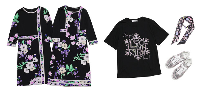 <画像左から 限定ドレス¥176,000、¥187,000、Tシャツ¥38,500、スカーフ¥19,800、スニーカー(予約商品)¥77,000 いずれも税込価格>