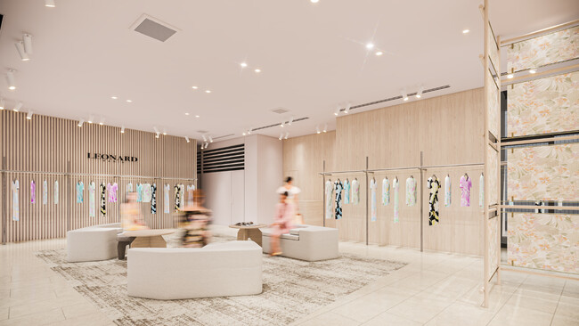 約220平方メートルの広さの同店は、エレガントな温かみのある建築で、パリのエッセンスを反映した気品ある空間になっています。ファサード部分には、LEONARD PARISのブランドロゴとNEWロゴを左右に設置し、伝統と革新の融合を表現しています。