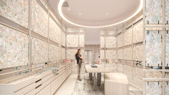 さらに店内奥にはプライベートサロンを設置。このサロンのために特別にデザインしたLEONARD PARISのグラフィックプリントを壁一面に施し、ブランドの世界観を表現。ロイヤルカスタマーのためのラグジュアリーなお部屋をご用意しました。また、プレスルームも店内に移設し、利便性を活かして、リース需要にも迅速に対応できる体制を整えていきます。