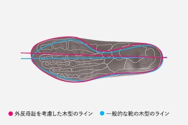 1. 当社オリジナルの、センターラインを親指寄りに振った「足なり設計」を採用。一般的な靴に比べてセンターラインが親指側に寄っており、前足部を幅広にすることなく、親指がまっすぐに伸びるフォルムを実現しました。足先周りに窮屈感を感じにくく、外反母趾の足でもポインテッドトウにチャレンジしやすいデザインです。