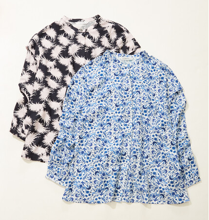 光沢と落ち感のある綿レーヨンの生地に植物柄をプリントしました。