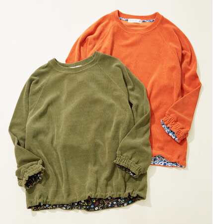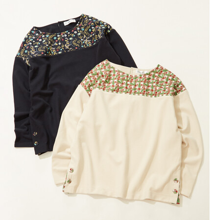 もちっとした触り心地が魅力のカットソー生地を使用。肩ヨークをプ リント生地で切り替えているので、顔まわりが華やかに。コーディネー トのワンアクセントにもなります。