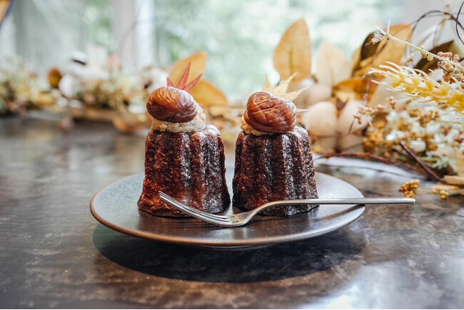 同じく人気の特製カヌレは、オーツミルクを使用しさっぱりとした味わいの当店自慢のカヌレ生地に栗と自家製モンブランクリーム、「食べられる紅葉(もみじ)」をトッピング。栗の旨みをたっぷり感じられる濃厚なモンブランクリームと、外はカリッと、中はもっちりとしたカヌレの食感は、相性抜群です。