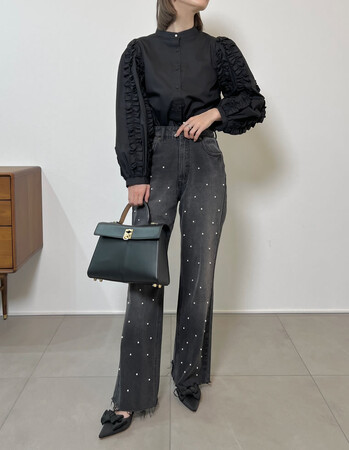 パールorラインストーンワイドストレートコットンデニムパンツ