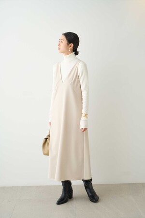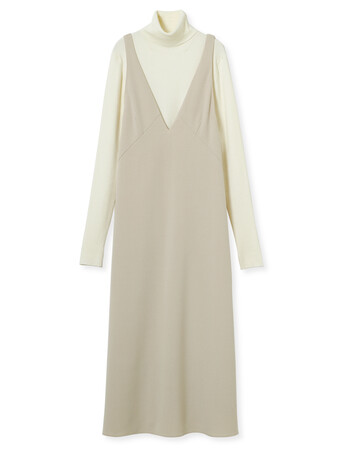 Vネックキャミソールワンピースと、ベーシックなタートルニットのセットアイテム。