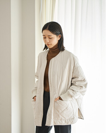 表地にリサイクルポリエステルを使用し、表情豊かなキルティングとスタンダードな無地をリバーシブルで楽しめるミドル丈アウター。身体をすっぽりと包み込むAラインのシルエットで、ヒップが隠れる丈感は使い勝手良く、スリムパンツやロングブーツとも相性抜群。
