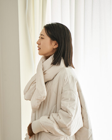 軽い着け心地ですが、見た目以上の暖かさが魅力。キルティングコートとのセット着用もおすすめですが、ベーシックなデザインなのでお手持ちのアウターとも合わせやすいストールです。