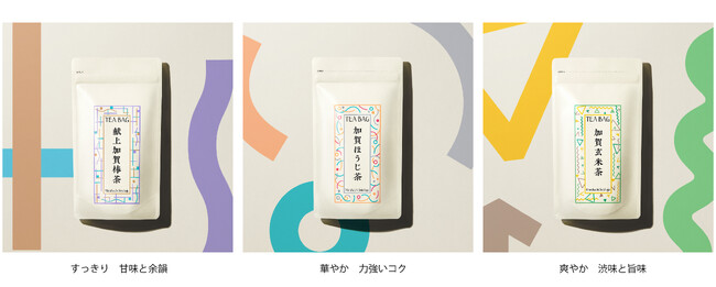 献上加賀棒茶はすっきりとした芳ばしさ。加賀ほうじ茶は華やかで力強いコク。加賀玄米茶は爽やかな渋味を形にしました。すっきりとクリアな印象のブルー系は献上加賀棒茶。華やかな温かみのあるレッド系は加賀ほうじ茶。焙煎米の芳ばしさを黄色系で表した加賀玄米茶。