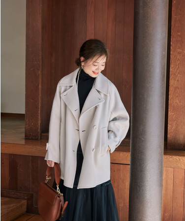 トラッドなピーコートをコクーンフォルムに仕立てた一着なら、今どき感のバランスも理想的。ダブルフェイスなのでとても暖かくふわっと羽織れる軽さも魅力のひとつ。旬顔のピーコートはタートルニットとの好バランスも考えました。”