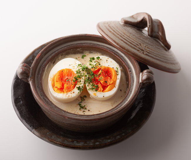 バーニャカウダソースの濃密な風味が豆腐に染み込み、コクのある湯豆腐となっております。半熟卵のトッピングによってさらに濃厚さがアップします。
