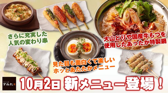 株式会社すみれ(所在地:東京都渋谷区/代表取締役:湯澤忠則)が運営する「やきとり家すみれ」は10月2日(月)からこれからの季節にぴったりなカラダも心も温まる”ホッとあたたか”な新メニュー『大山どりの麻辣鍋』や『バーニャな湯豆腐』など全18品の新メニューを全店舗で販売いたします。