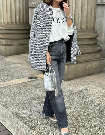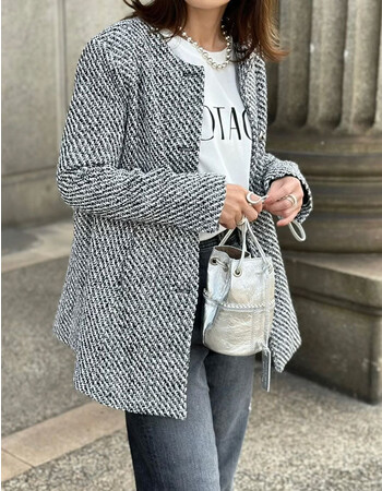 旬のペプラムシルエットで仕上げたツイード調のノーカラージャケット。 金ボタンがアクセントになり、モードな雰囲気を演出。 ヒップ周りはすっぽりと覆い、さりげなく体型カバーできるのが嬉しいポイント。 首元はすっきりとしたノーカラーなので、ハイネックトップスと合わせてもさまになります。