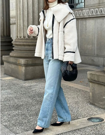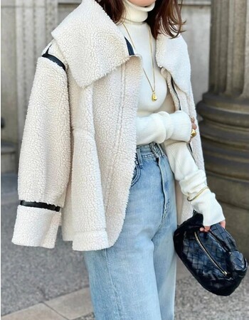 暖かみのあるふんわりとしたボア生地で仕立てたパイピングボアコート。 フェイクレザーの配色パイピングが、モードな雰囲気を引き立てます。 緩やかに広がるフレアシルエットにもこだわり、どこから見ても抜かりなく。 構築的なビッグカラーもポイントになり、さりげなく女性らしい印象を与えます。